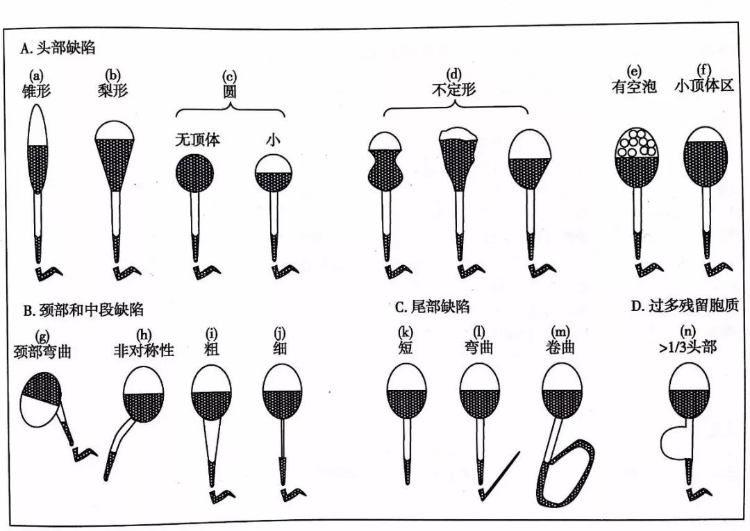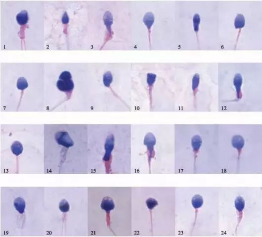 下面的图显示的是正常精子和各种畸形精子的形态,您可以直观地感受到畸形精子的异常形态,有头部缺陷、颈部缺陷、尾部缺陷等等各种形态。